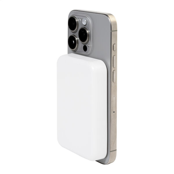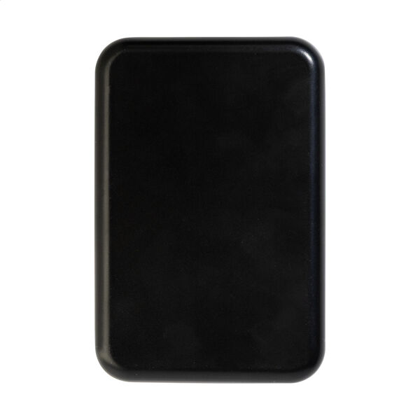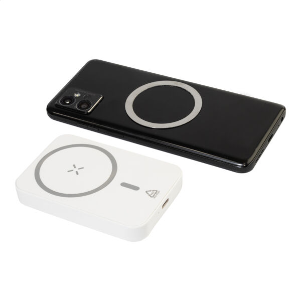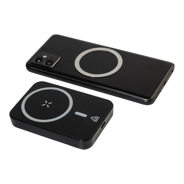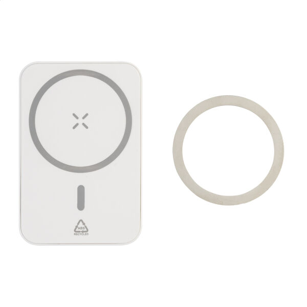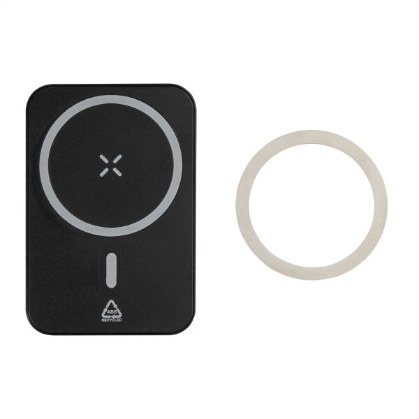 Gerecycleerde ABS powerbank met 5000 mAh batterij en ingebouwde magnetische draadloze snellader (15W). Met USB-C ingang en oplader poort. Inclusief zelfklevende metalen ring om de magnetische functie op elk draadloos oplaadbaar apparaat te gebruiken. Compatibel met iPhone® 12 of nieuwer. Inclusief USB lader kabel.
