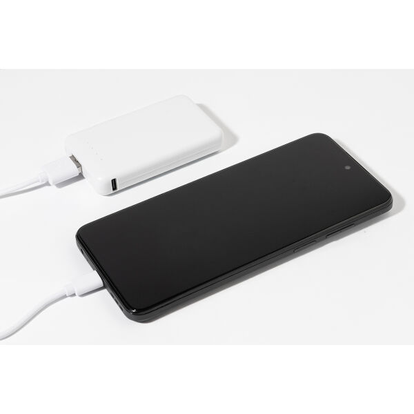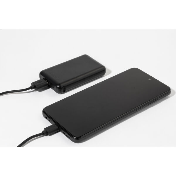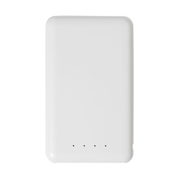 Gerecycleerde ABS compacte powerbank met 4000 mAh batterij. Met 1 USB en 1 USB-C laderpoorten. USB-C ingangspoort. Inclusief USB lader kabel.
