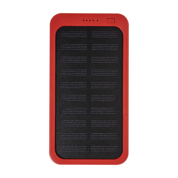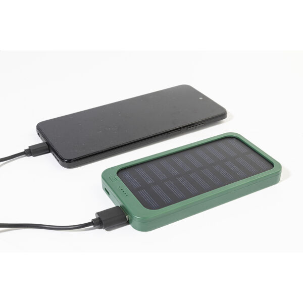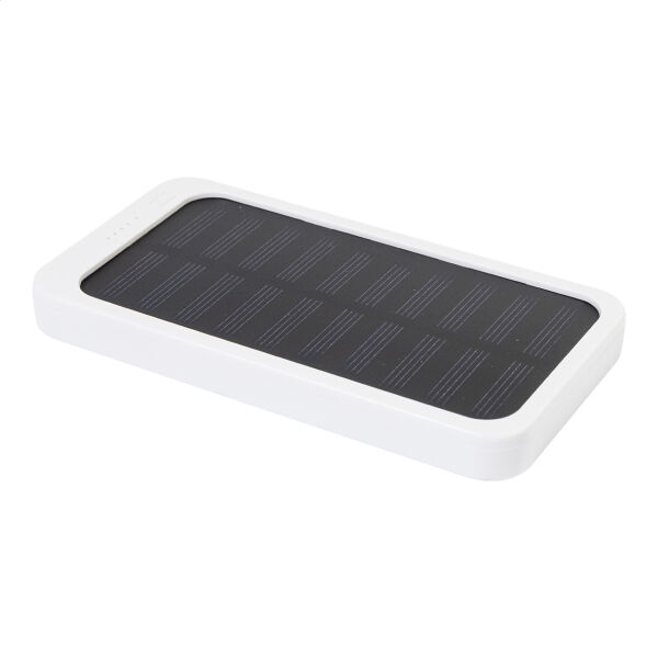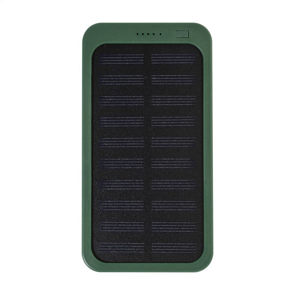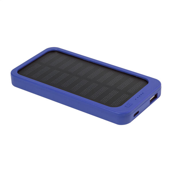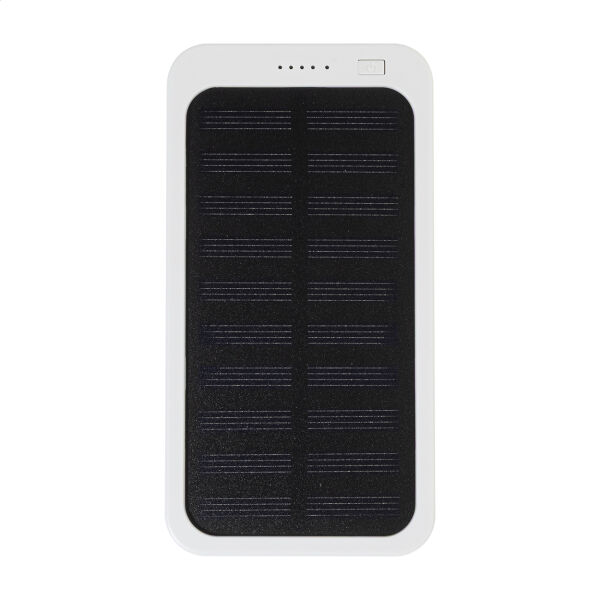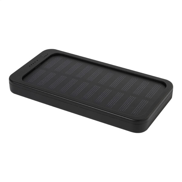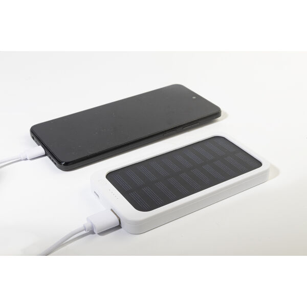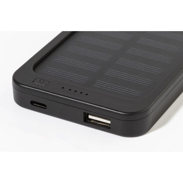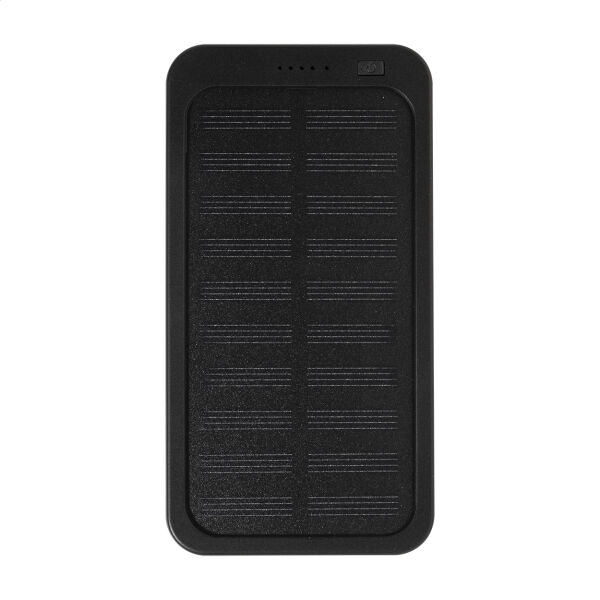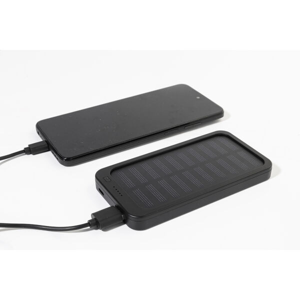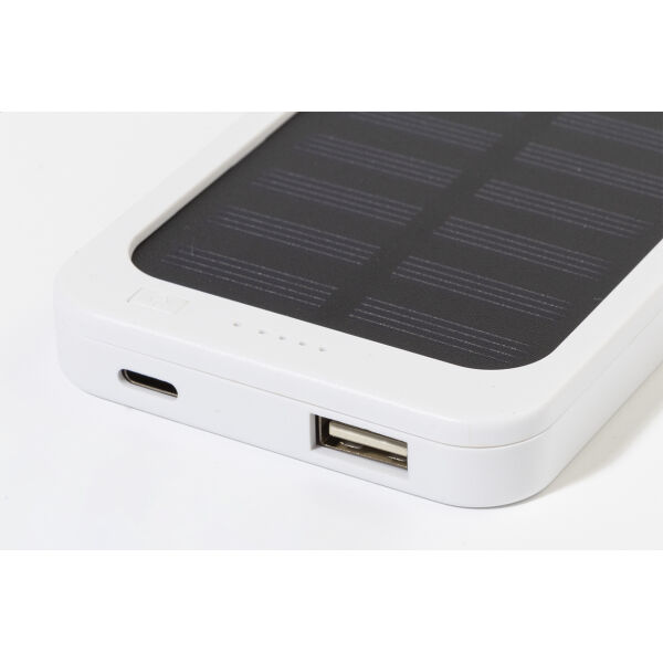 Gerecycleerde ABS powerbank met ingebouwde zonnelader en 4000 mAh batterij. Met 1 USB en 1 USB-C laderpoorten. USB-C ingangspoort. Inclusief USB lader kabel.